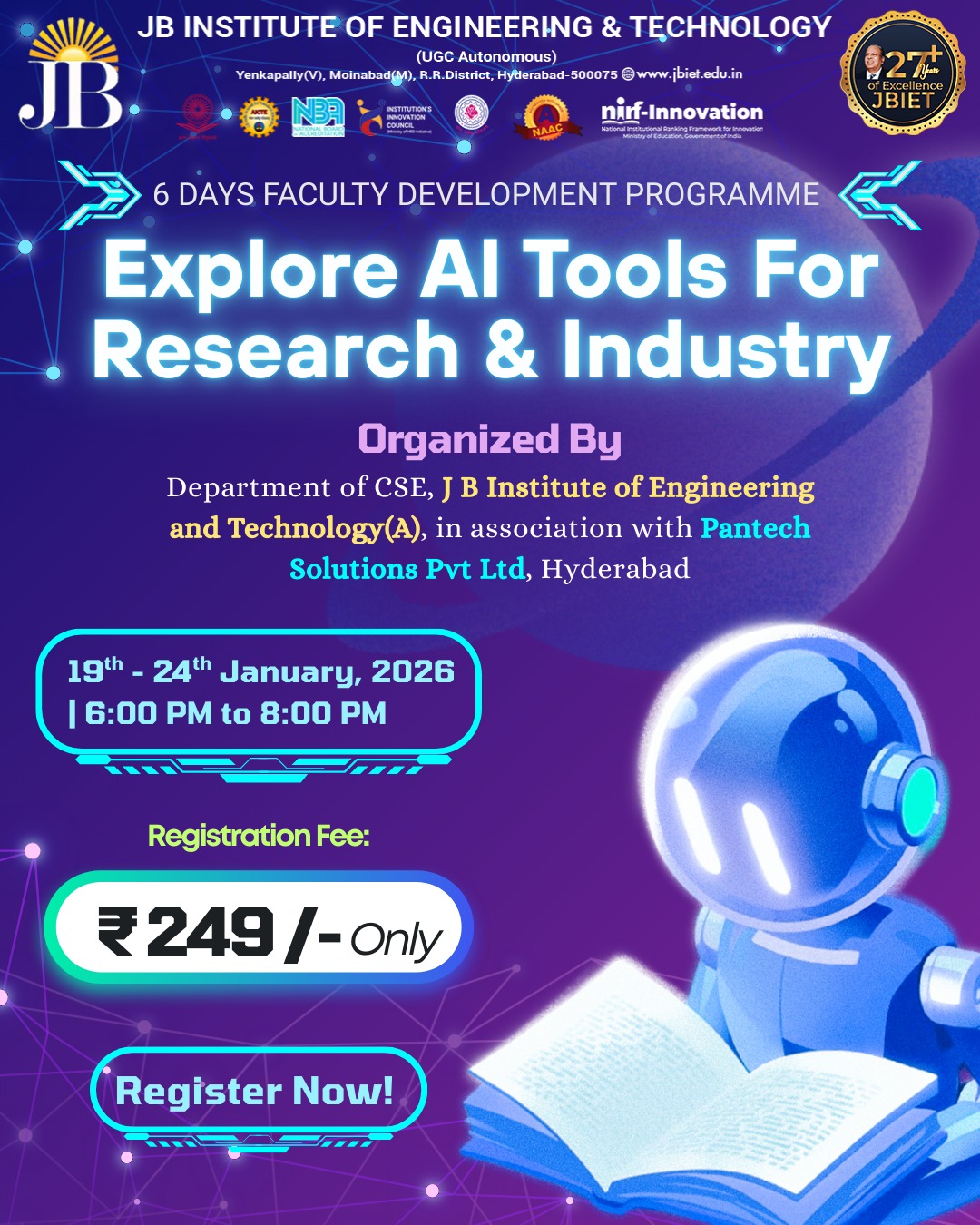The expert faculty at JBIET inculcate the best values and principles, ascribing to a modern curriculum; while the students imbibe pragmatic perception and a pro-active nature, which spurs them towards exploration and advanced inquiry, resulting in valuable insights.